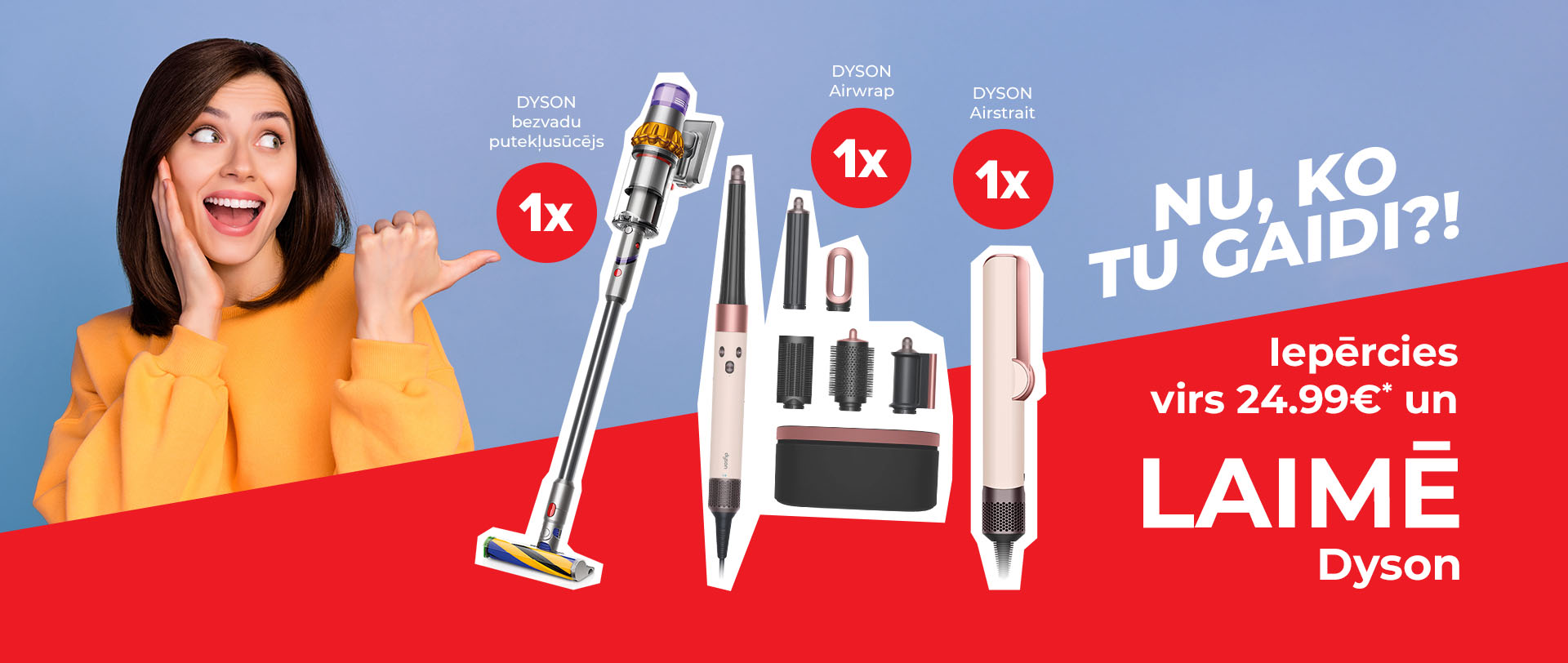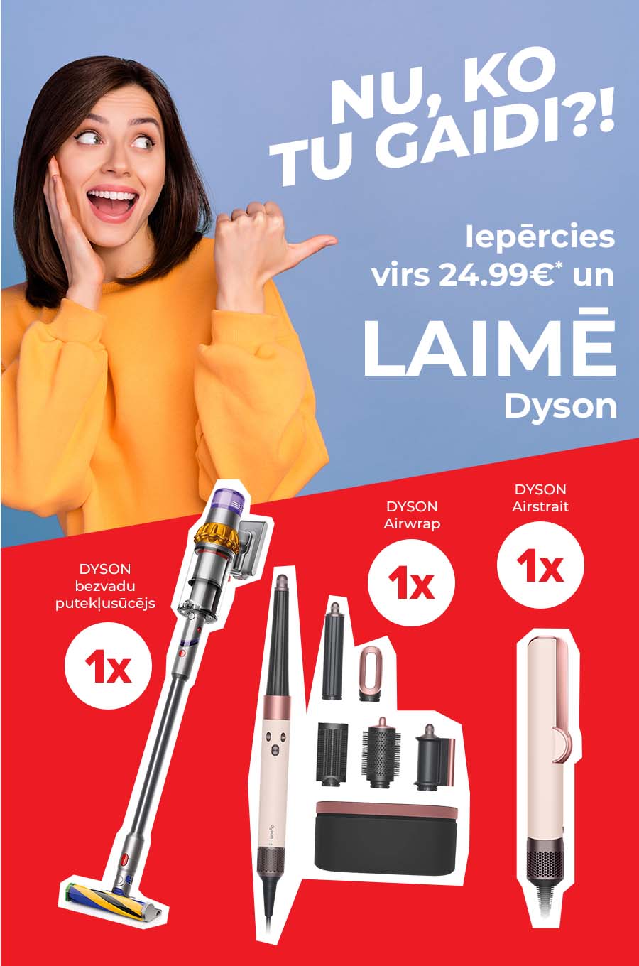 No 2026. gada 2. janvāra līdz 2. februārim iepērcies Barbora.lv par vismaz 24.99 EUR*, reģistrē pirkumu loterijas.lv un piedalies izlozē. Laimē kādu no kārotajām DYSON ierīcēm. ⚡